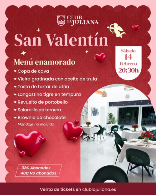 La noche comenzará a las 20:30h con una copa de cava de bienvenida, dando paso a un menú exclusivo cuidadosamente elaborado para sorprender a los paladares más enamorados:
